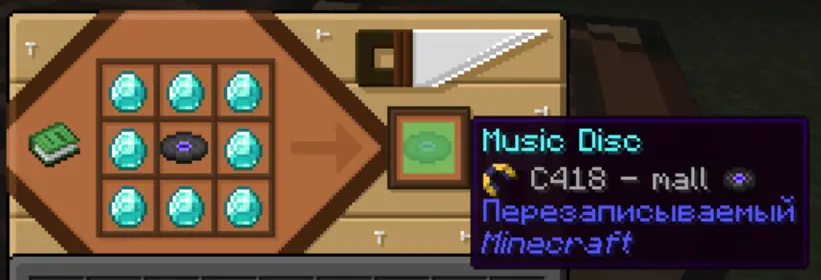 Для запису треку потрібно скрафтити музичний диск/ріг із можливістю перезапису, поєднавши будь-яку платівку з 8 алмазами в довільному порядку в верстаті: